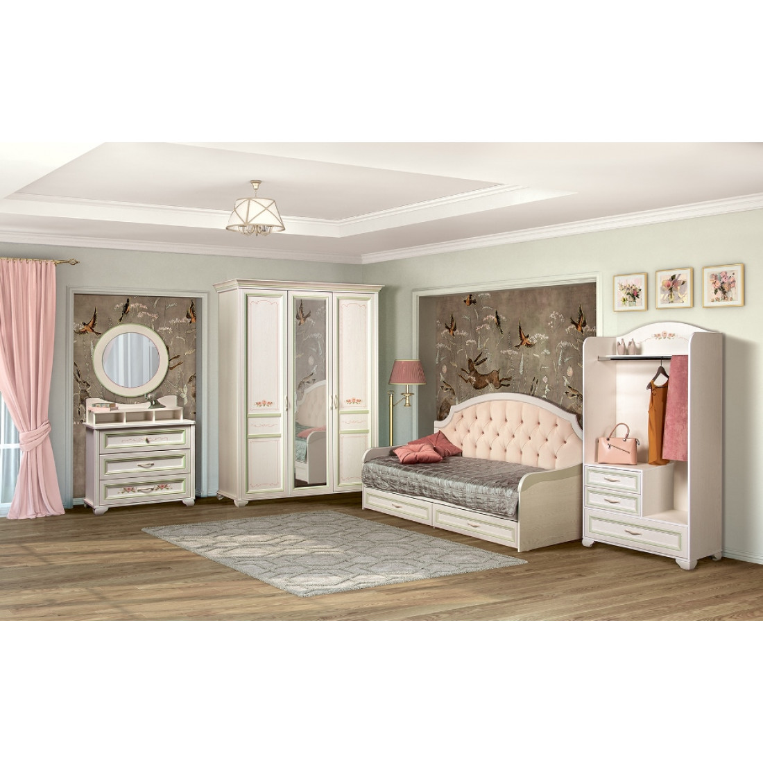 Корпус: ДСП, декор – ясень белый. Основание кровати – ламели