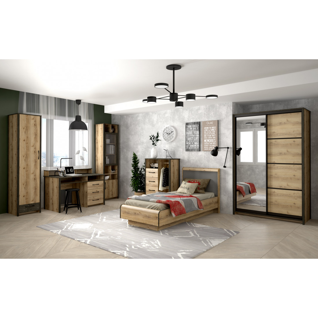 Корпус: ДСП, декор – дуб делано. Основание кровати – ламели