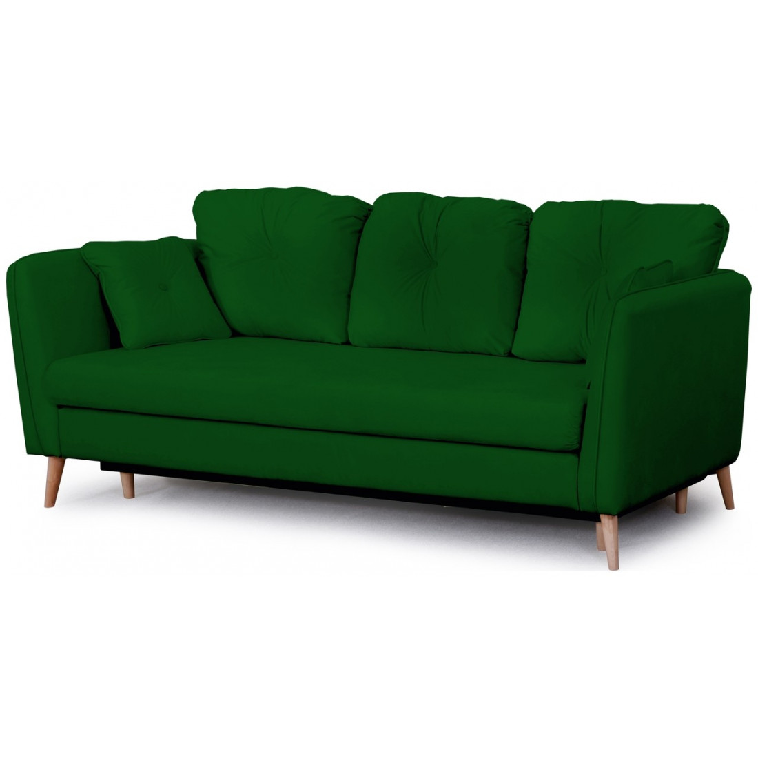 Диван украшают декоративная отстрочка, декоративные утяжки с пуговицами на подушках. Опоры дивана из массива березы подчеркивают стилистику.