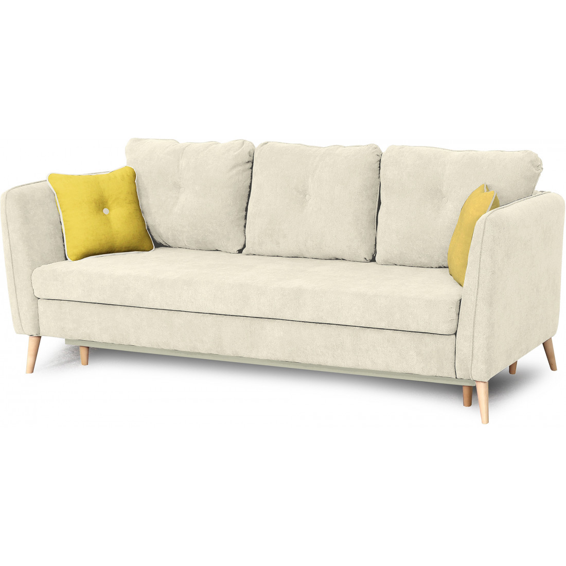 Диван украшают декоративная отстрочка, декоративные утяжки с пуговицами на подушках. Опоры дивана из массива березы подчеркивают стилистику.