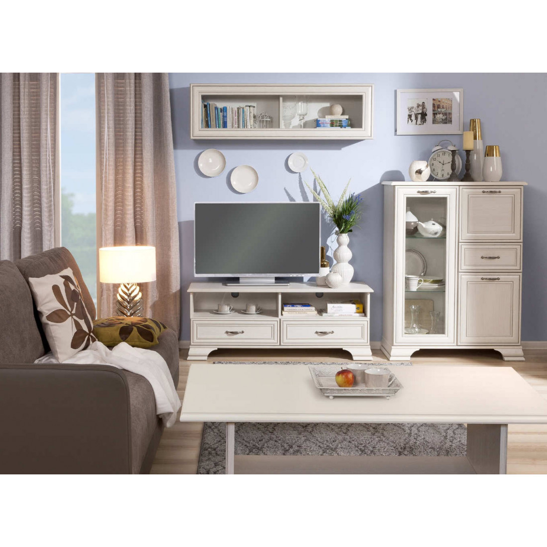 Гостиная Тиффани - это классика, которая всегда остается модной и стильной. Сочетание светлого оттенка с древесной структурой, нежных фасадов, обрамленных изящными планками с патиной и качественных металлических ручек создадут атмосферу тепла и уюта, а возможность использования подсветки делает эту коллекцию особенно привлекательной. Основное достоинство TIFFANY - эстетическая функциональность, которая роскошно дополнит различный по назначению интерьер.