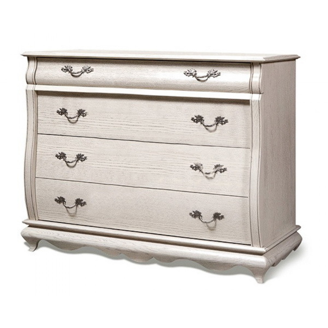 Классический широкий комод для спальни из коллекции "Оскар" это оптимальный вариант для комнаты любого размера. Он вместителен, удобен и хорошо смотрится в интерьере. Слегка выгнутые формы и растительный узор фурнитуры подчеркивают его общий с остальными предметами коллекции стиль. Фасад выполнен из массива дуба, выдвижные ящики на направляющих. Модель окрашена в оттенок "Белая эмаль с патиной".