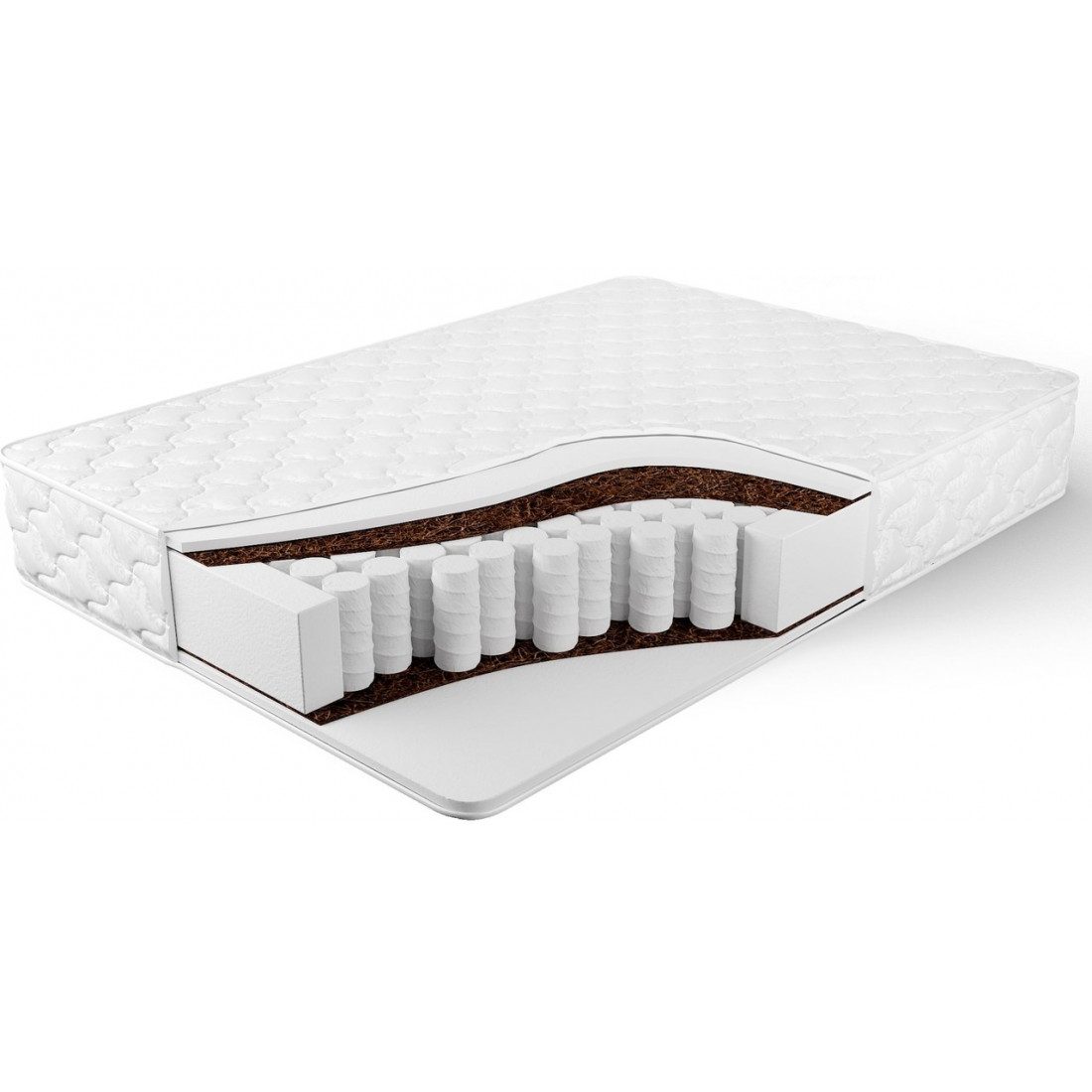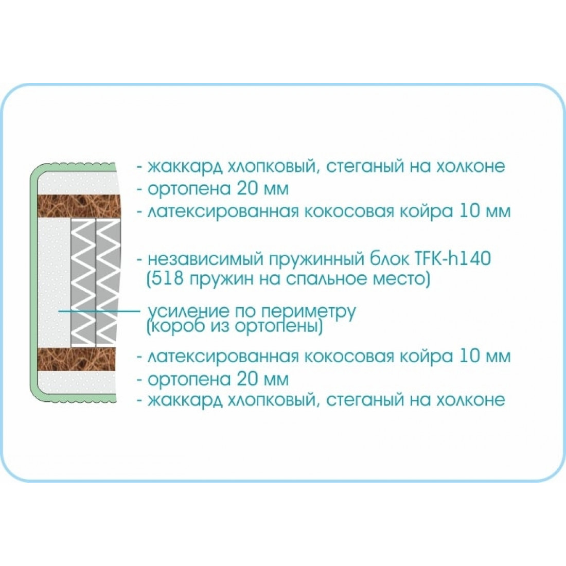 Наполнение: независимый блок TFK, высота блока 140 мм, ортопена 20 мм с двух сторон, кокосовая плита 10 мм с двух сторон, усиление по периметру - короб из ортопены.