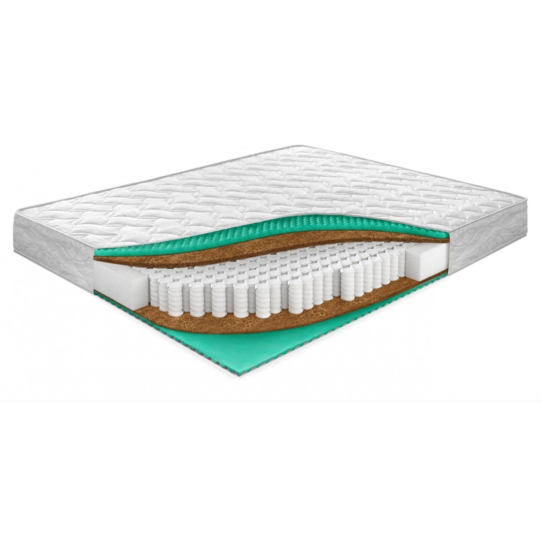 Наполнение: независимый блок TFK, высота блока 140 мм, массажная пена 40 мм с двух сторон, кокосовая плита 10 мм с двух сторон, терморегулирующий слой с 2-х сторон, усиление по периметру - короб ортопены.