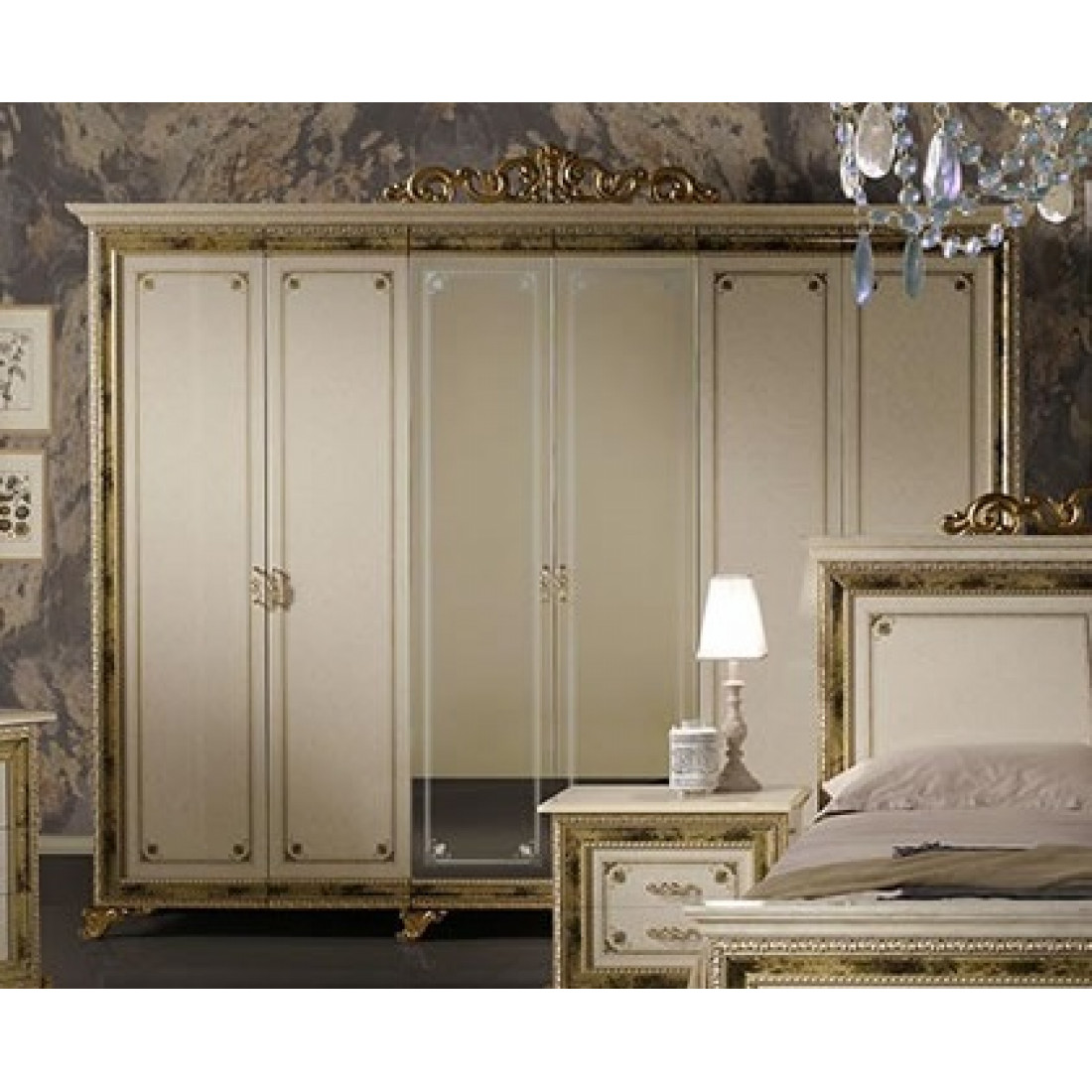 Шестистворчатый шкаф для одежды Катя (беж) от Российской фабрики «ДИА мебель» выполнен в бежевом цвете с  глянцевым покрытием и резными вставками на фасадах, покрытые золотым цветом. Шкаф поделен на три большие части. Каждая из которых имеет не только полки для одежды но и большую штангу для вешалок. Такой большой и вместительный шкаф будет незаменимым модулем для вашей спальни.