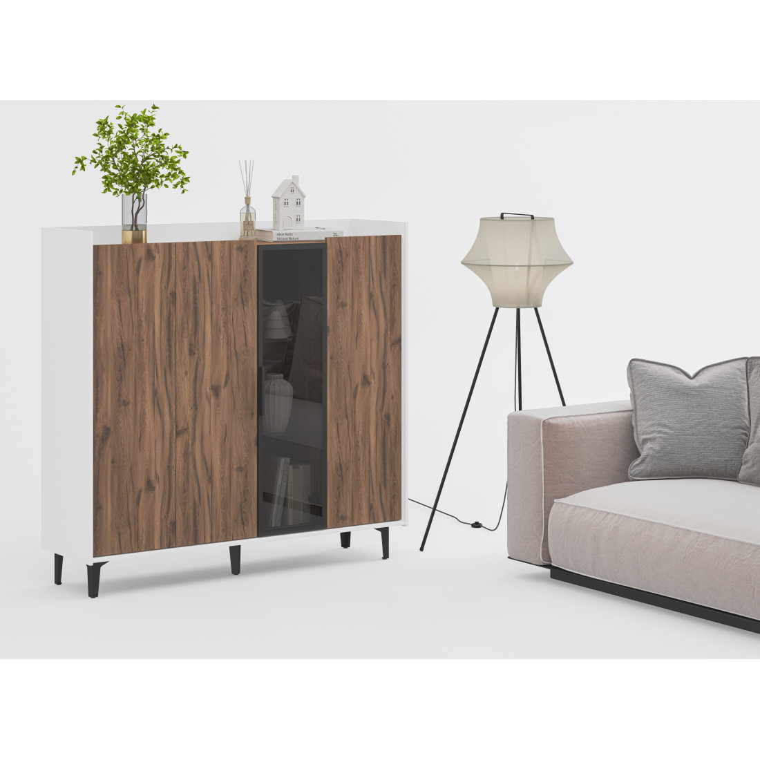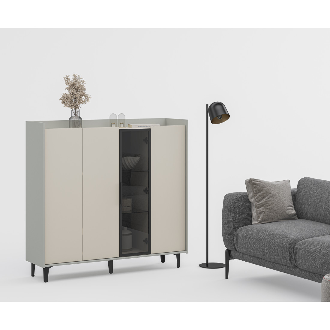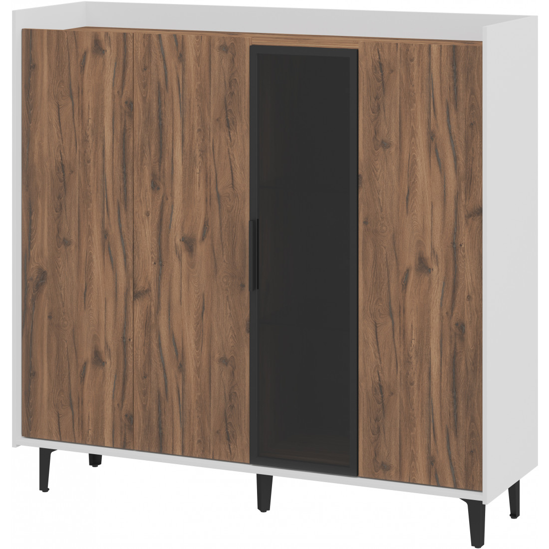 Элегантный шкаф Модена создает изысканную атмосферу в вашей гостиной. Предлагается в трех стильных вариантах цветов: Белый-Дуб Элисон, Лунный камень-жемчуг, Металл Бруклин-лунный жемчуг. Ножки из металла обеспечивают прочную поддержку. Темное стекло добавляет утонченности дизайну. Шкаф имеет три отделения с полками для удобного хранения, а также одно отделение со стеклянными полками и стеклянным фасадом, придающим ему элегантность. Идеальное решение для организации пространства в вашей гостиной