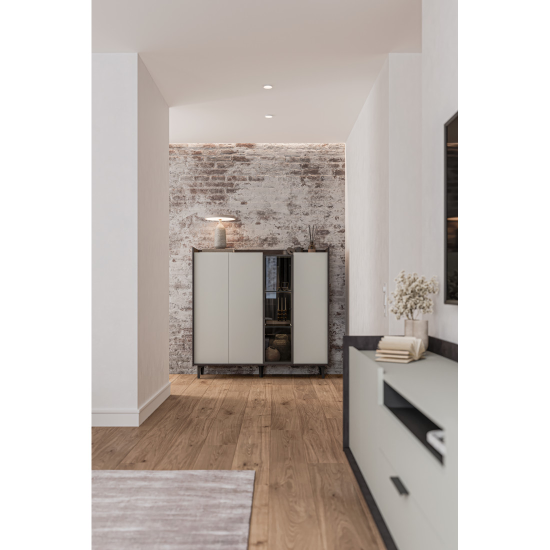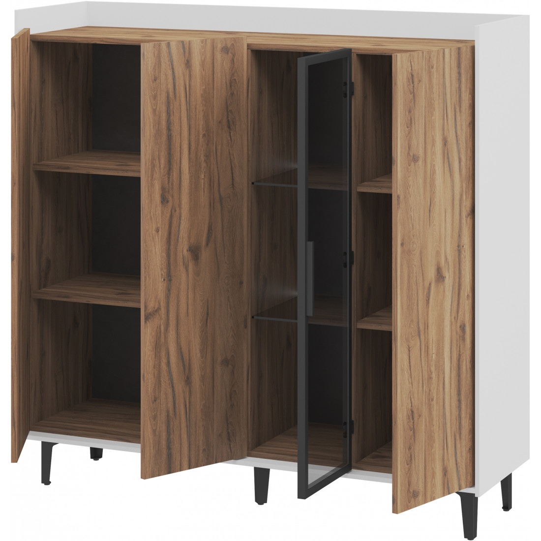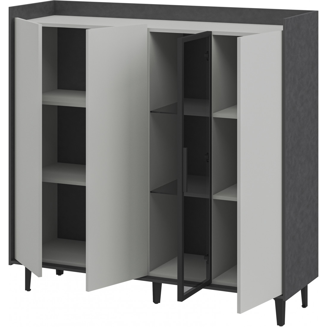 Элегантный шкаф Модена создает изысканную атмосферу в вашей гостиной. Предлагается в трех стильных вариантах цветов: Белый-Дуб Элисон, Лунный камень-жемчуг, Металл Бруклин-лунный жемчуг. Ножки из металла обеспечивают прочную поддержку. Темное стекло добавляет утонченности дизайну. Шкаф имеет три отделения с полками для удобного хранения, а также одно отделение со стеклянными полками и стеклянным фасадом, придающим ему элегантность. Идеальное решение для организации пространства в вашей гостиной