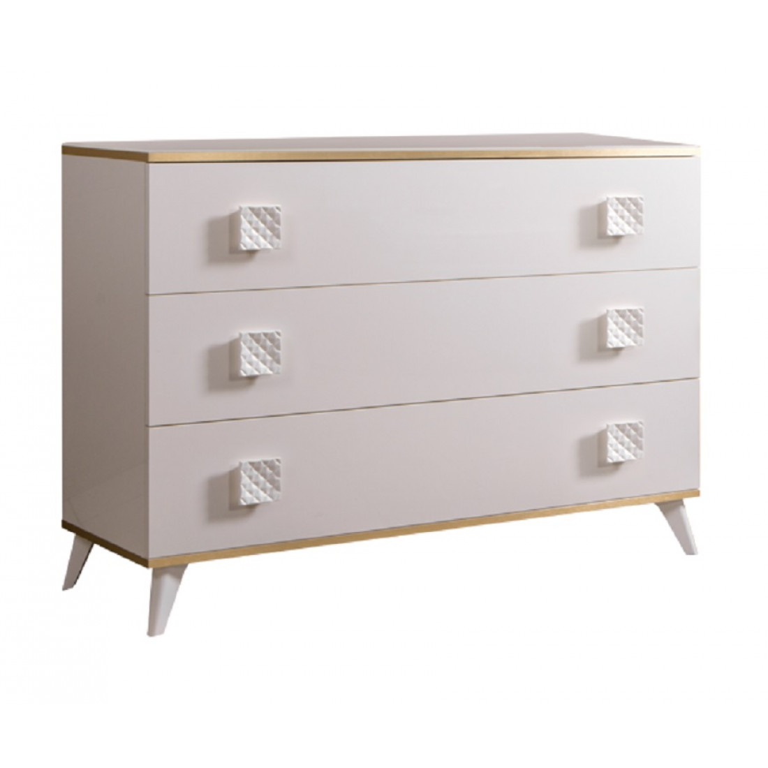 Хорошим технологическим решением стали ножки в тумбочках и комодах спального гарнитура «Diora». Они расположены немного под наклоном к центральной части корпуса, что позволяет добиться хорошей устойчивости в тоже время с точки зрения дизайна это решение не стандартно, так как визуально нарушает гармонию горизонтальных и вертикальных линий, соответственно привлекает к себе больше внимания.