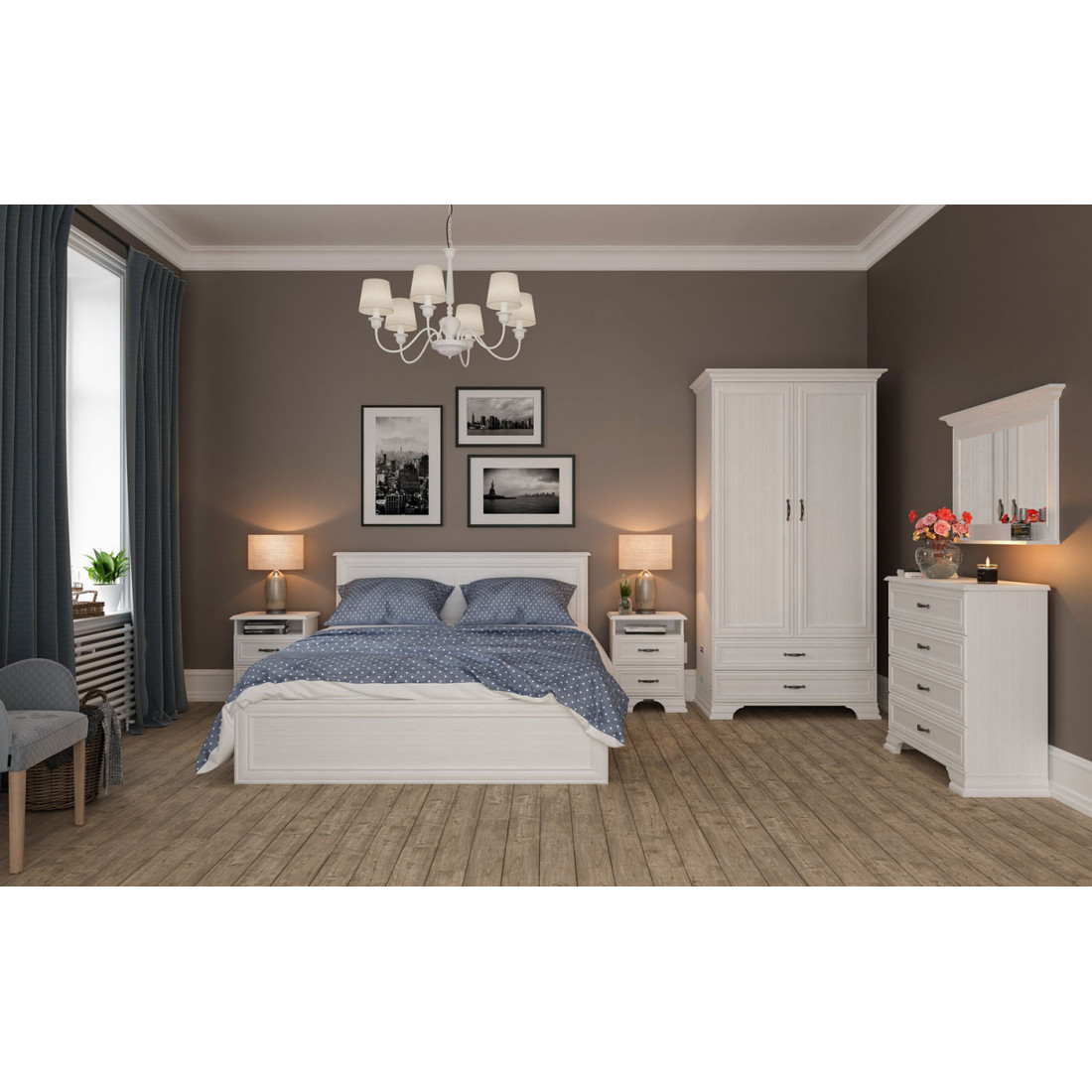 Спальный гарнитур Юнона от Мебель-Неман композиция 1 - гарнитур в классическом стиле с отделкой структурной фактуры, обрамленный рамочным фасадом, где металлические ручки выгодно подчёркивают стиль и изящество, всегда актуален и востребован.