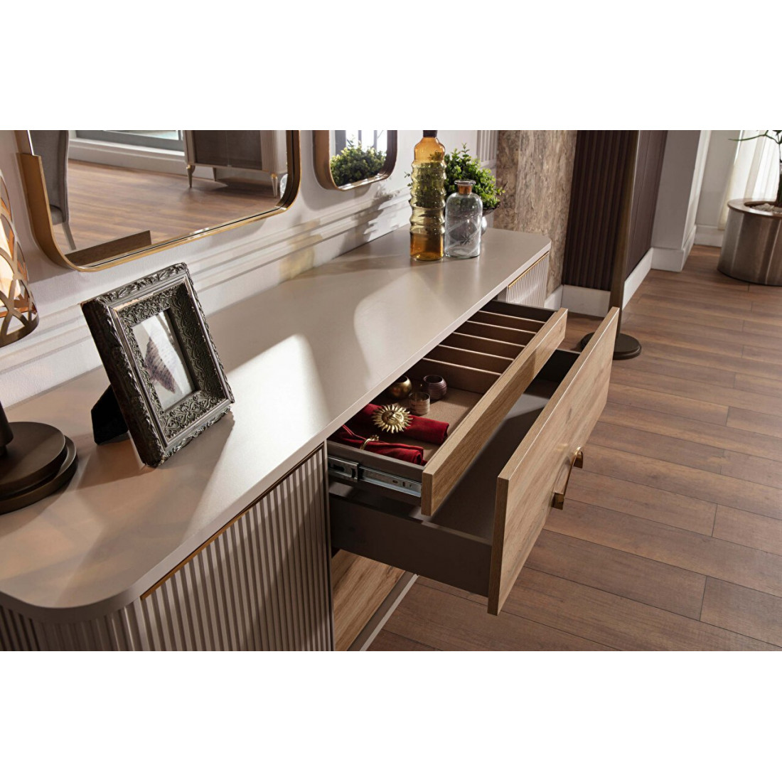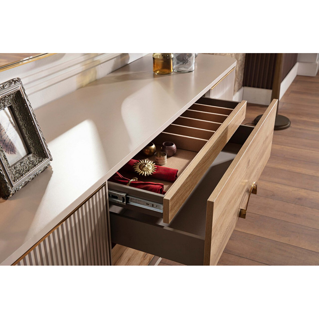 Тумба Санвито SANV-10 от турецкого производителя Bellona станет украшением Вашей гостиной, столовой, залы как в квартире. так и загородном доме. Достаточно длинная (185см),неглубокая (48см), но вместительная, она может использоваться как прилавок, буфет, комод. Тумба Sanvito имеет два глубоких ящика, а также внутренний потайной ящичек для столовых приборов или разных мелочей. Округлые, плавные формы тумбы прекрасно сочетаются с оригинальными ножками. Вертикальные линии фасадов кремового цвета в обрамлении золотистой каймы дополняют древесную фактуру центральных ящиков. Круглая золотистая ручка ящиков подчеркивает оригинальность дизайна.